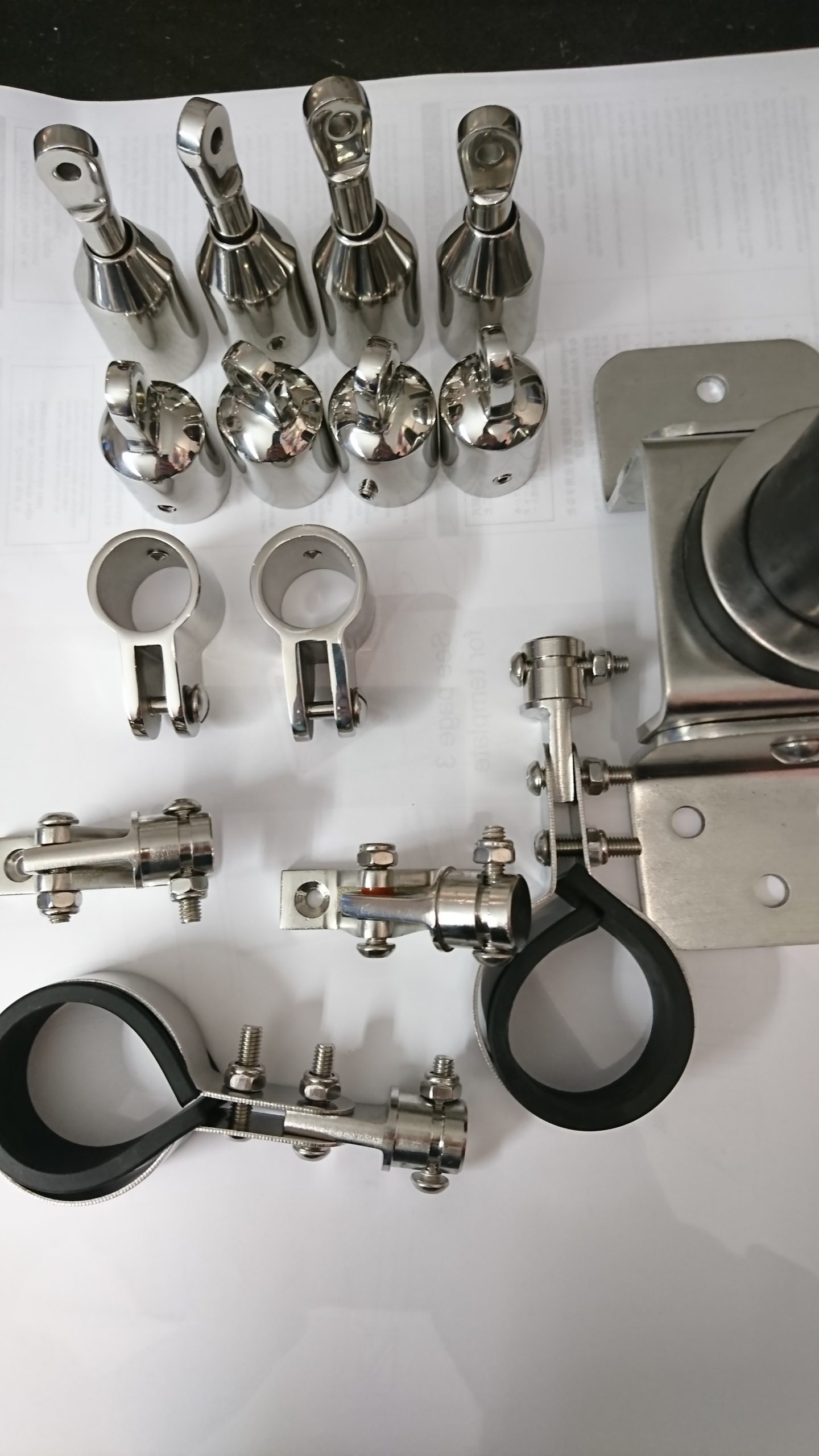 Die Hauptstrebe nach vorne haben wir in Absprache mit einem uns bekannten Statiker verstärkt. Heisst, in das 25/2 Rohr wird noch ein 22/2 Edelstahlrohr eingeschoben und an den Enden verschweißt. Auch alle Fittinge werden zusätzlich verschweißt und verbolzt. Die vorhandenen Madenschrauben der Fittinge sind für diese Konstruktion völlig unbrauchbar.