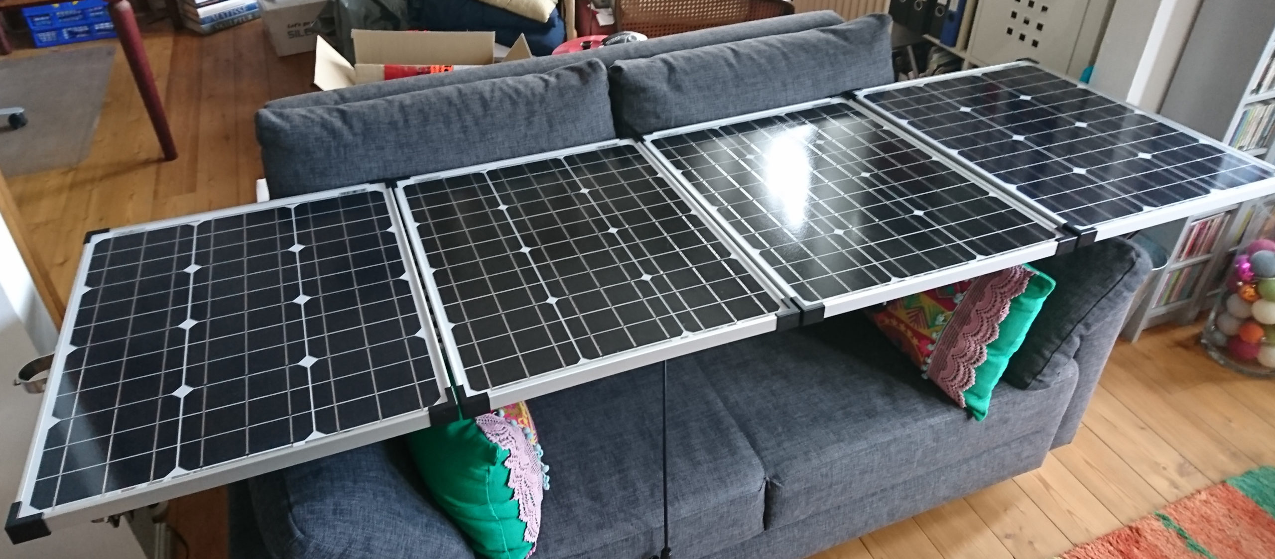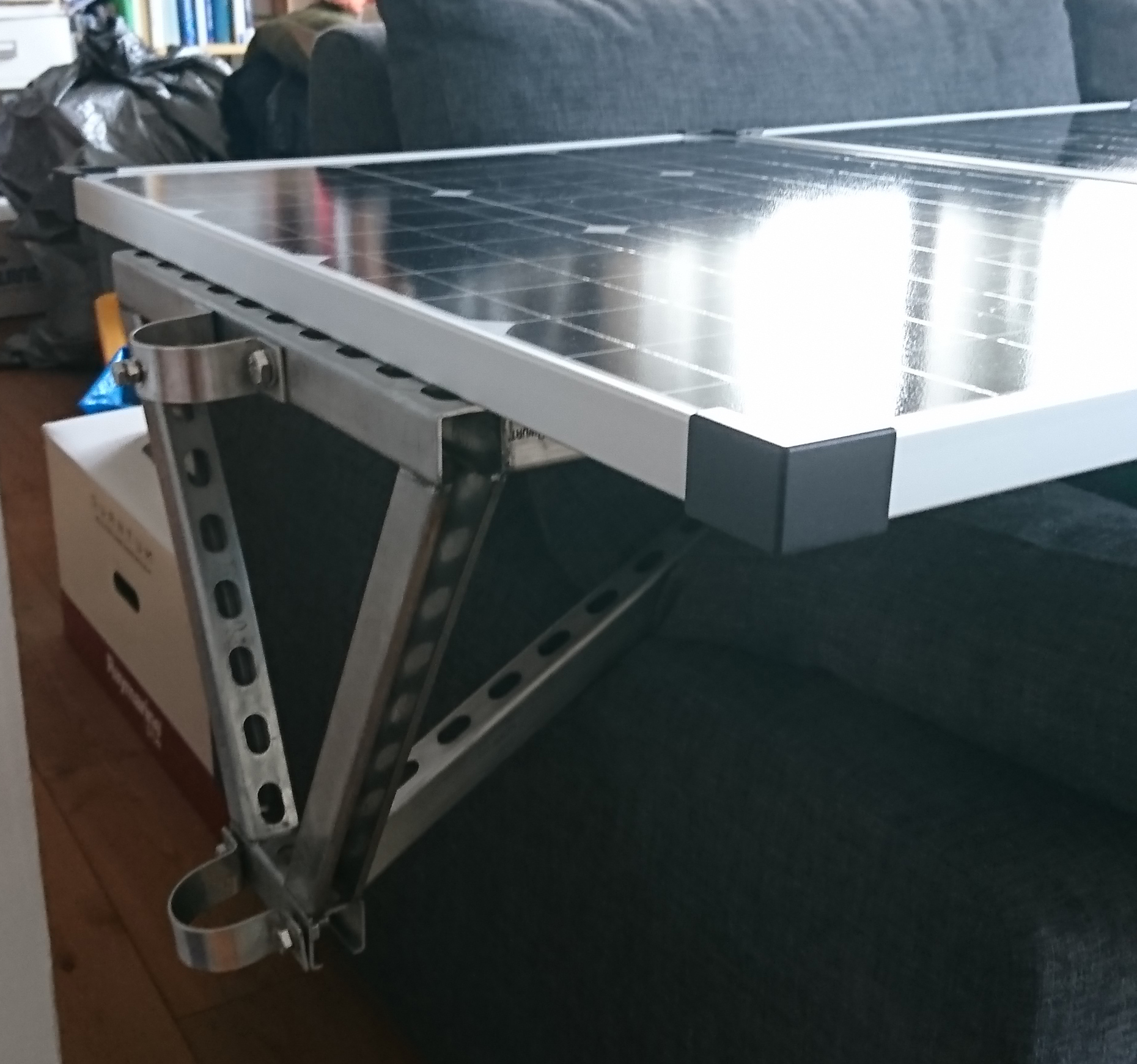 Die Fußmontage (Montageset von Silentwind)  haben wir erledigt, bevor Karl aus dem Wasser kam. Danach konnten wir auch die Verstrebungen und die dafür notwendigen Rohre ausmessen. Mitte Dezember sind die beiden Masten trotz eisiger Kälte tatsächlich montiert.  Die Brücke ist ausgemessen und kann gefertigt werden. Mittlerweile liegt sie bei uns zu Hause fertig zur Montage. Wir haben uns für Montageschienen aus V4A entschieden, weil sie das Optimum aus Gewicht, Statik und Flexibilität bilden. Auch die Solarpaneele sind inzwischen da.