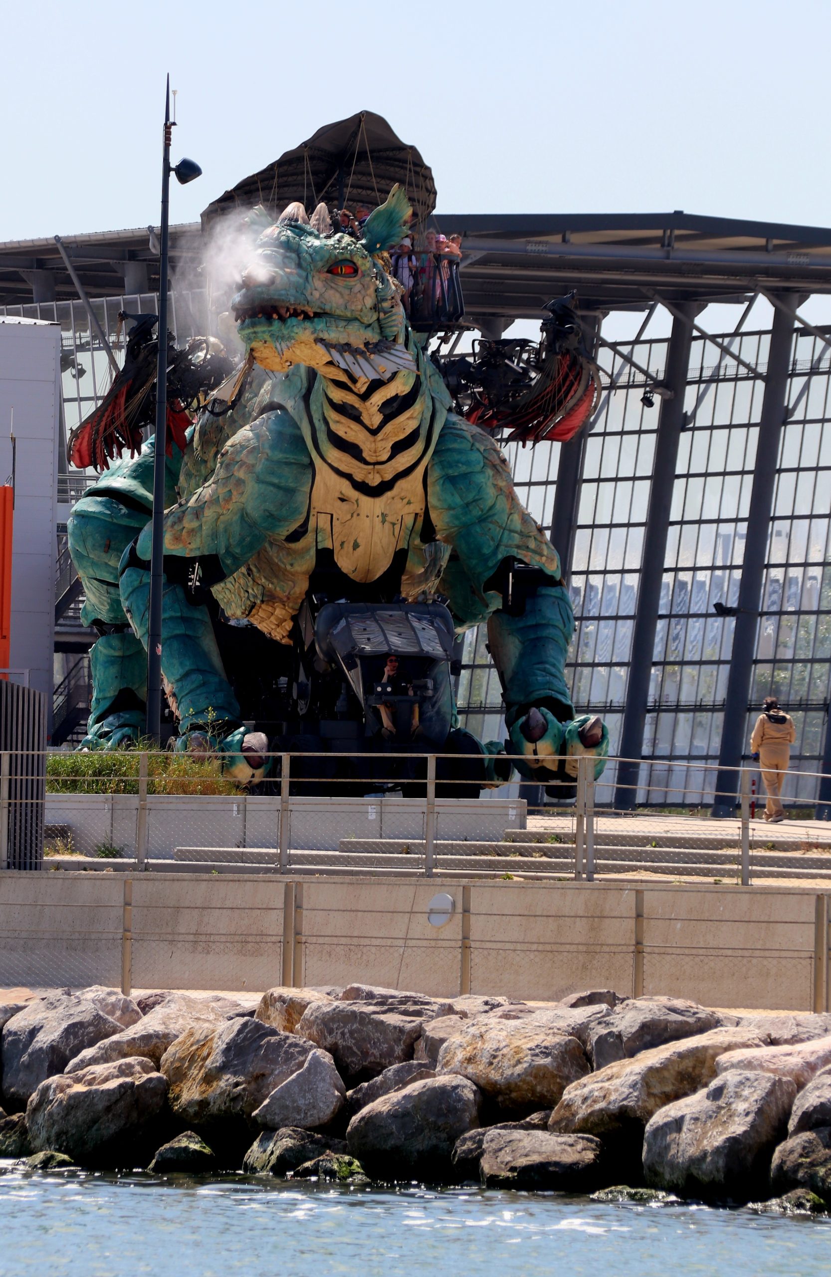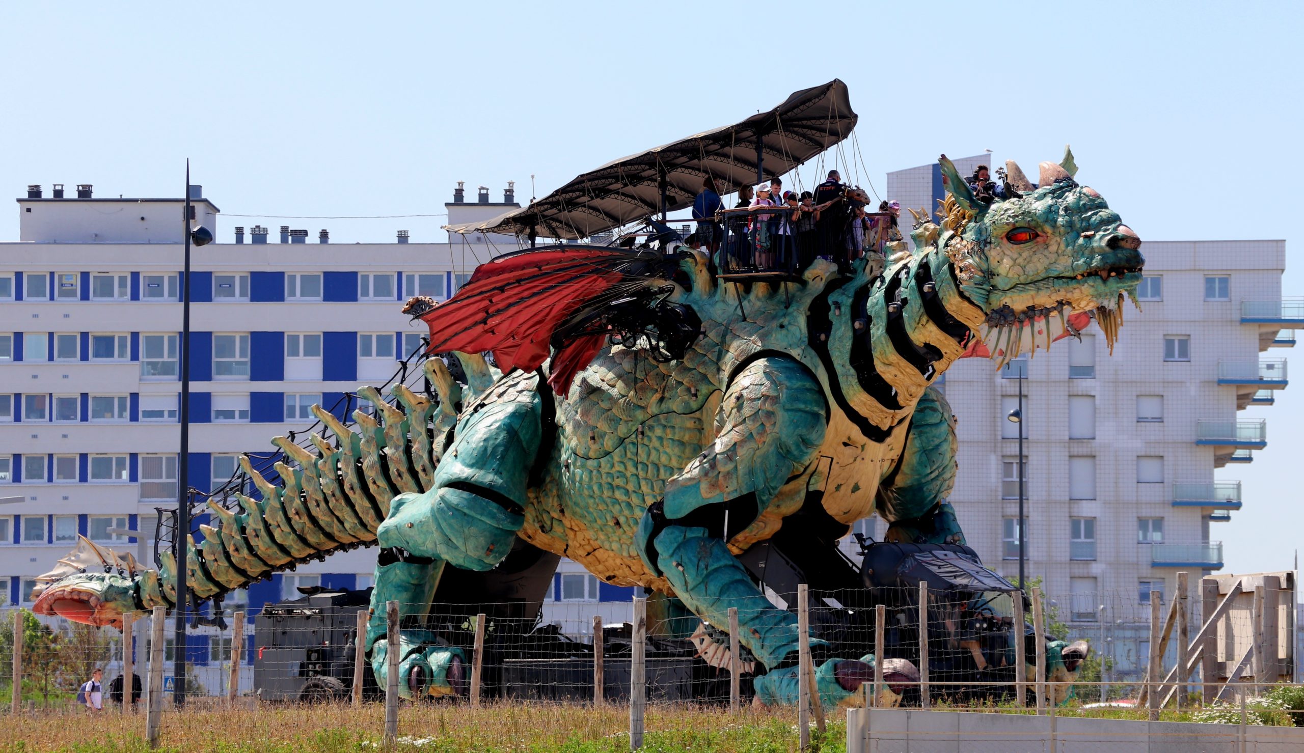 Immerhin die Sonne ist uns gnädig. In der Hafeneinfahrt von Calais werden wir von einem lauten, sehr lauten Zischen und Fauchen begrüßt. Erst beim dritten Mal können wir das Geräusch identifizieren: Wir sehen IHN. Den Drachen von Calais ! Er brüllt und faucht uns an… hmmm keine freundliche Begrüßung.