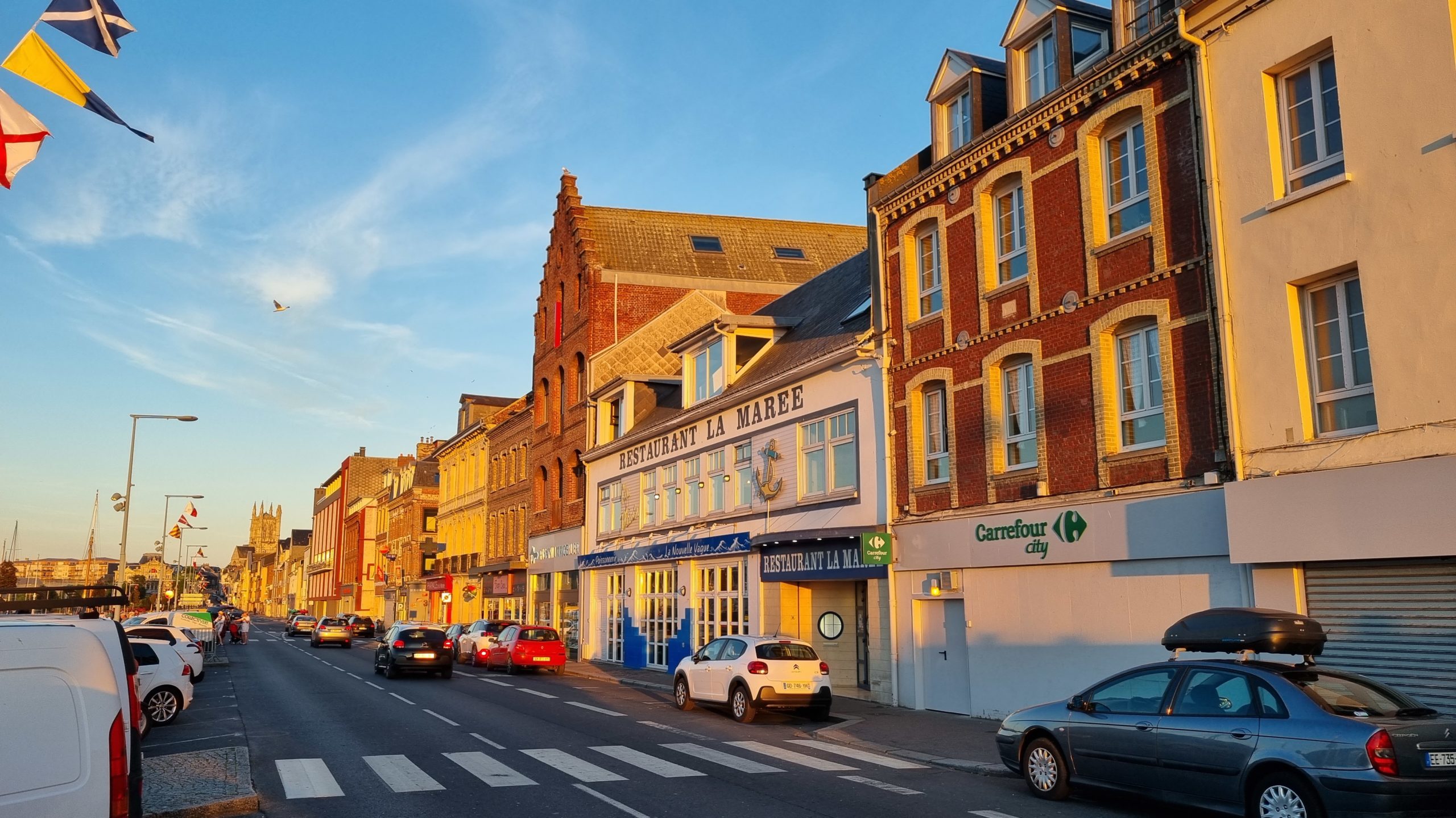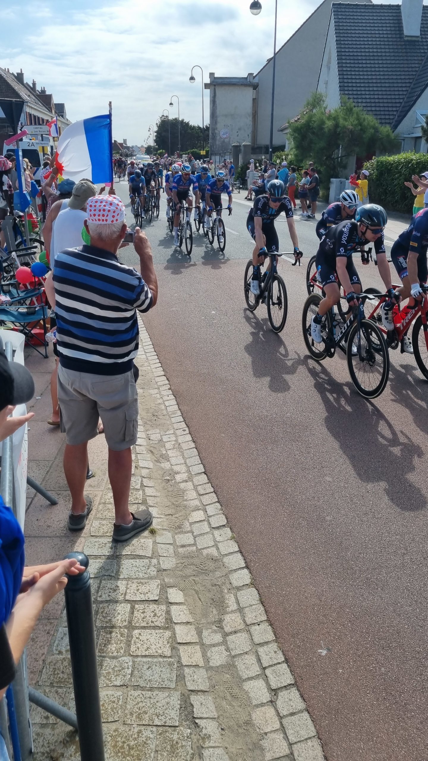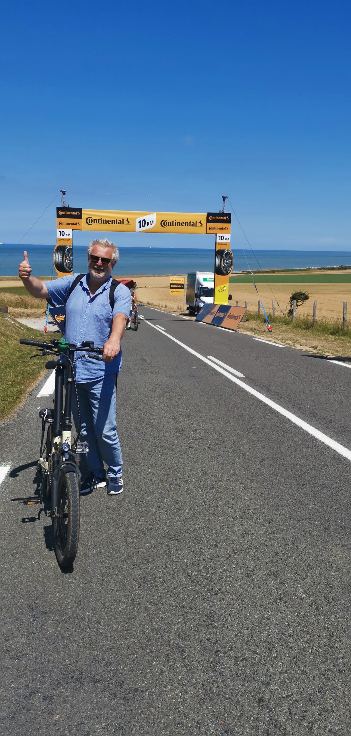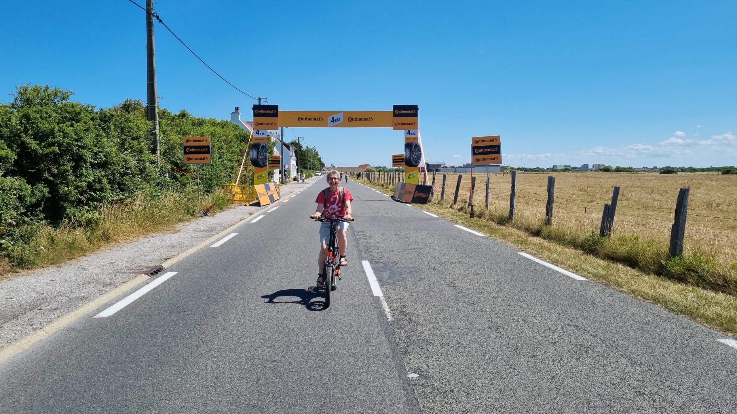 Calais ist im „Tour de France“ Fieber und am nächsten Tag Etappenziel. Also lassen wir uns nicht lumpen und wechseln die Sportart. Am nächsten Morgen fahren wir auf der schon abgesperrten Straße dem Pieton bis zum Cap de Blanc Nez entgegen. Es ist toll, die Begeisterung bei den Franzosen zu sehen. Überall wird gefeiert, gegrillt und herrscht gute Laune. Man hat sich für diesen Tag Urlaub genommen. Selbst wir werden immer wieder lautstark auf der ansonsten so gut wie leeren Straße angefeuert 🙂 eine wirklich tolle Radtour im Zeichen der Tour de France. Natürlich warten wir dann auch auf die Durchfahrt der Profis. Eine Stunde vorher rasen etliche Reklamewagen über die Strecke. Laute Musik von den Wagen und es werden alle möglichen kleinen Werbegeschenke geworfen. Die eigentliche Durchfahrt der Radler ist dann schon fast unspektakulär, denn man hat sie kaum gesehen, sind die Fahrer an uns vorbei . Dies mit allem drumherum erlebt zu haben ist interessant und auch spektakulär. Abends ist in der Stadt die Hölle los. Wir haben Glück, mit der Familie von Silkes Bruder, die hier in der Nähe Urlaub machen, noch einen Platz im Restaurant zu bekommen.